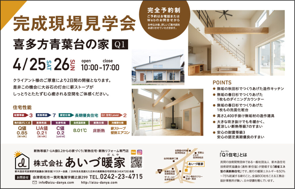 おおきな、おおきな吹き抜けと大谷石の灯台に凛とたたづむ薪ストーブのお住まいが完成しました。クライアント様のご協力のもと完成現場見学会を2026/4/25(土)4/26(日)の2日間開催させていただきます。是非この機会にあんしんの耐震等級3(認定長期優良住宅)冬暖かく夏涼しい断熱等級7(UA値0.21)のお住まいをご体感いただければ幸いです。ご見学はプライバシー配慮の観点から完全予約制とさせていただきます。お電話またはEメールにてお申込みお願いできれば幸いです。おりかえし詳しいご案内図お送りさせていただきます。何卒よろしくお願い申し上げます。