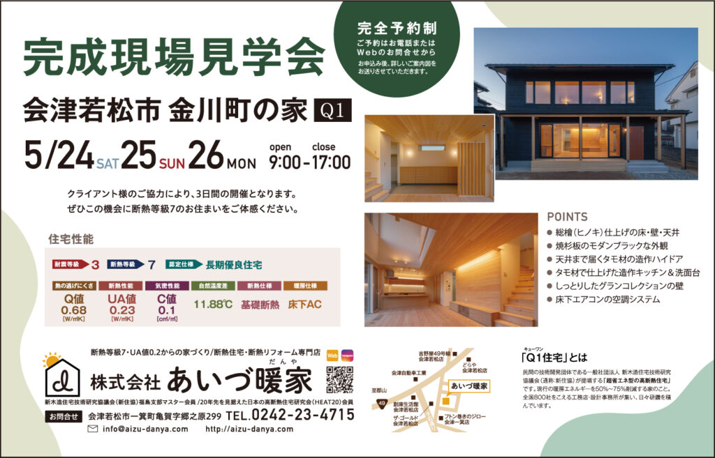 このたび、クライアント様のご厚意により、完成現場見学会を会津若松市金川町内において 5/24【土】5/25【日】5/26【月】の3日間開催させていただきます。今回のテーマは【素材に触れる完成見学会】です。 床材は檜(ヒノキ)の節のある材・壁・天井は檜(ヒノキ)無地上小の羽目板です。最近TVで伊勢神宮の式年遷宮(20年に一度の建て替え工事)の檜(ヒノキ)材を集める作業が始まられたと放映されていますが、伊勢神宮の檜は長野県~岐阜県にまたがる木曽地方の檜材(木曽檜)が主に使われますが、時折岐阜県の東濃地方の檜も使われることもあります。古来より木曽は【表木曽】東濃は【裏木曽】と呼ばれています。当然ながら、この地方からとれる檜(ヒノキ)材は全国でも特に綺麗で上品な木材です。今回の会場では、東濃檜(ヒノキ)をたっぷり採用させていただきました。
