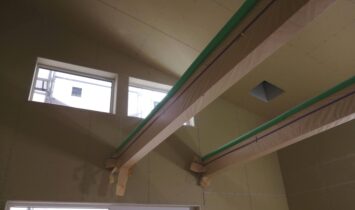 青葉台の家Q1では、カバ桜無垢フロアーの施工がはじまりました。赤白がきつくないカバ桜をお選びになられたクライアント様。階段もカバ桜で色を統一させます。画像は赤っぽいけど、現物は白っぽいです。吹き抜けの杉無垢化粧梁です。養生してあってお披露目までもう少しですが、薪ストーブとのコントラストが…